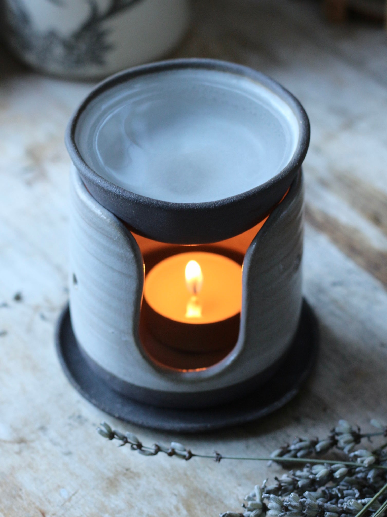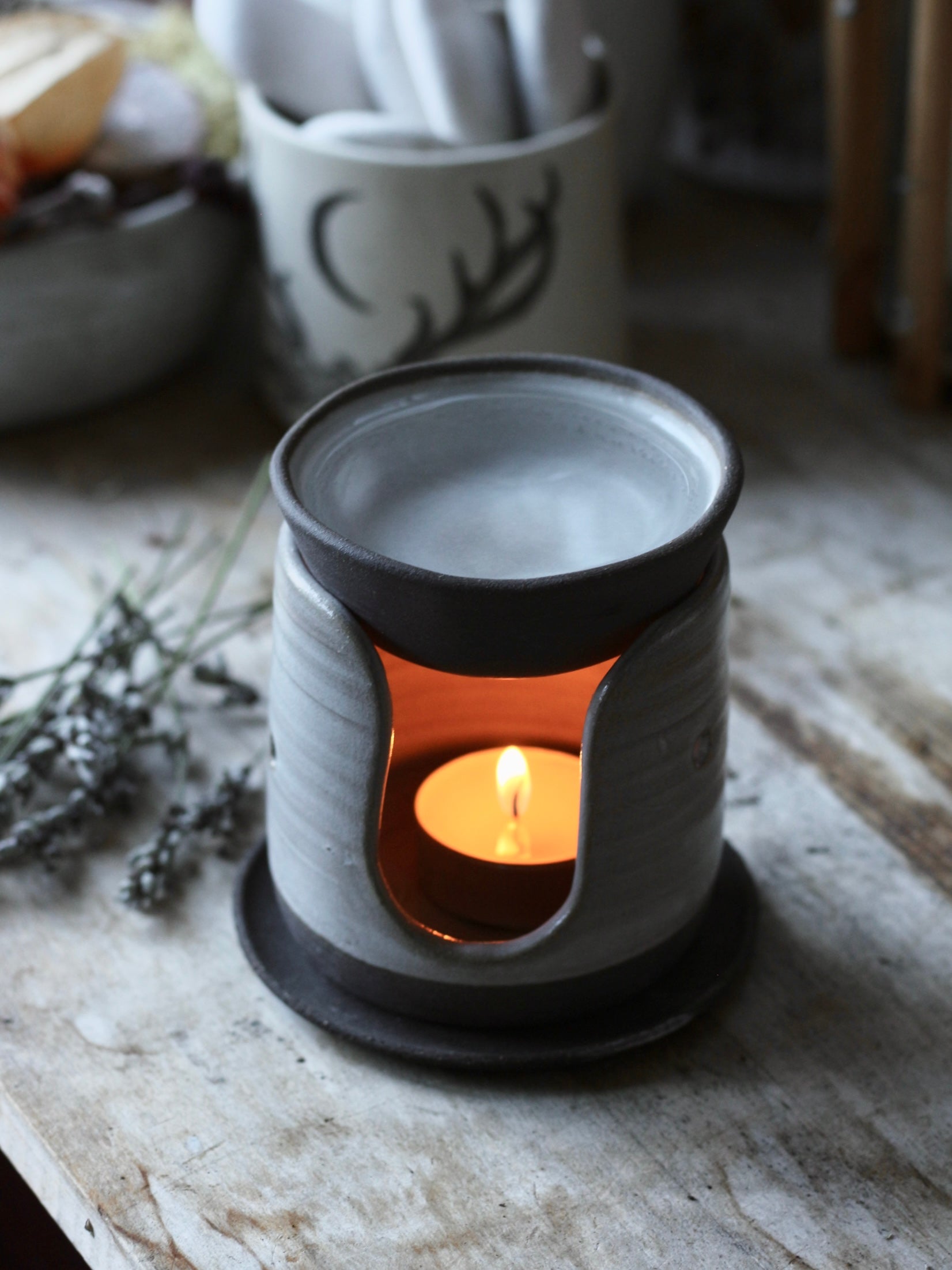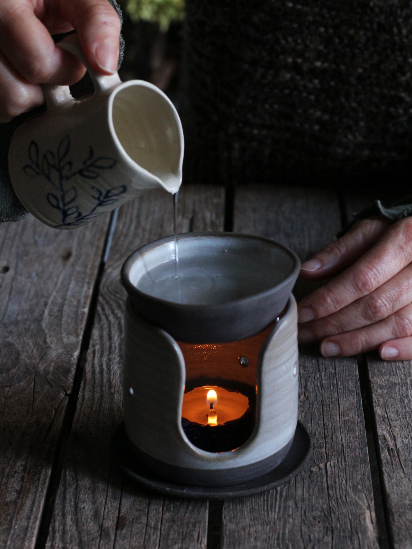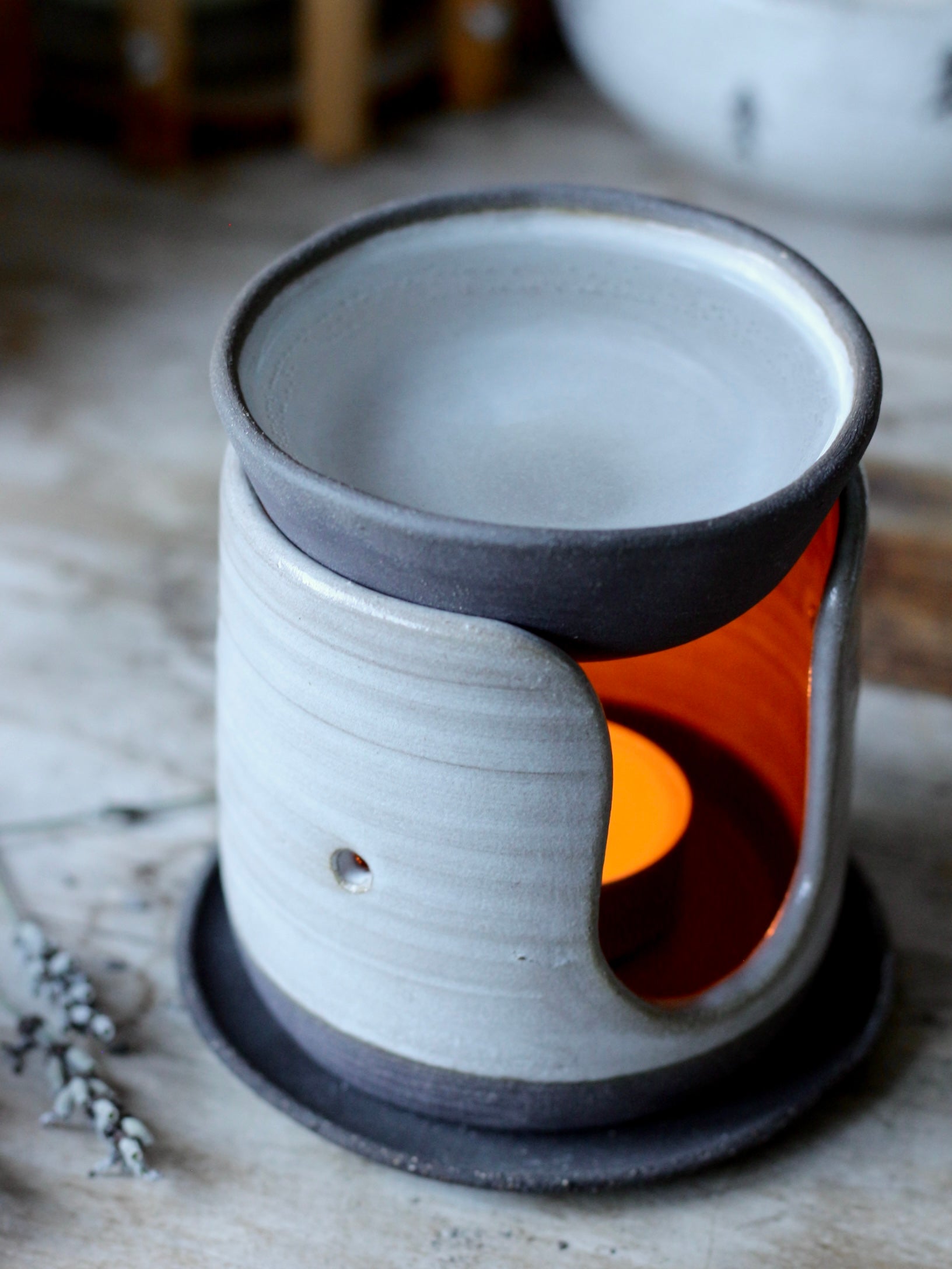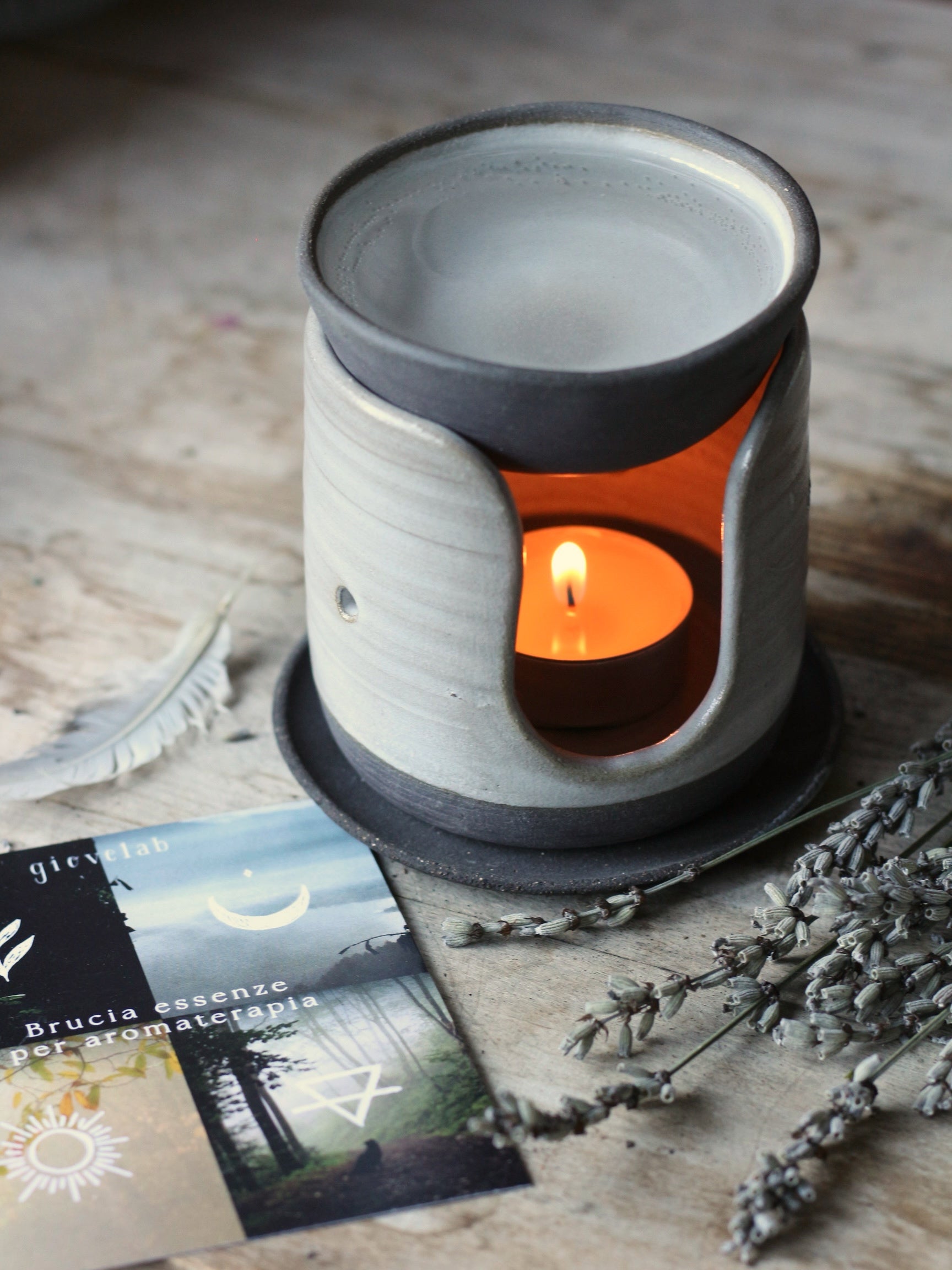 Non un oggetto per la tavola, questa volta, ma un prezioso strumento di benessere per anima e corpo! Vi presentiamo il nostro primo brucia essenze per aroma terapia: è realizzato in un elegantissimo gres nero, cotto ad alta temperatura, con coppetta a contrasto e piattino d'appoggio (nr. 3 parti). L'acqua contenuta nella coppetta supera la durata della candelina standard (3 ore), ma vi raccomandiamo comunque di spegnere la candela quando lasciate la stanza per qualche tempo. Questo oggetto è stato testato con un utilizzo continuativo di moltissime ore, dunque usatelo con tranquillità. Tutto il corpo in ceramica si scalderà leggermente, la coppetta sarà più calda per poter svolgere la funzione di scaldare l'acqua e diffondere l'aroma dell'olio essenziale nell'aria. Ogni parte del brucia essenze è lavabile in lavastoviglie. Enjoy!