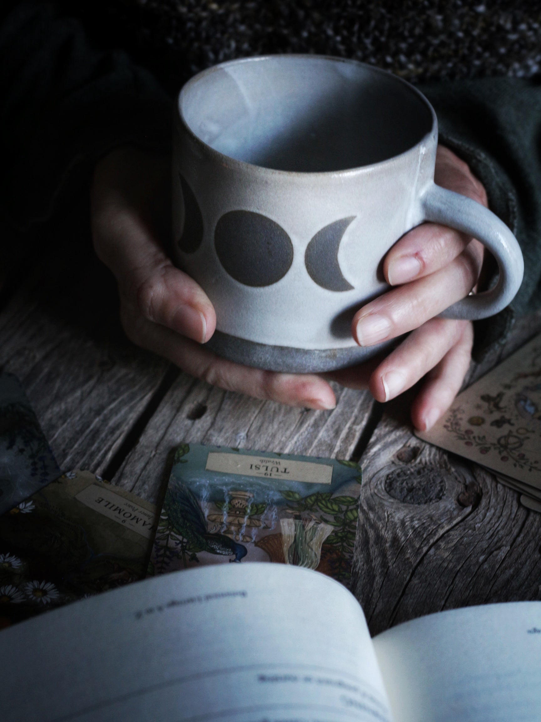 E' arrivata finalmente una tazza "mug" super capiente, per tutte le anime lunari amanti dei tè, delle tisane, dei macha latte, dei golden milk e di tutte le bevande calde che portano conforto all'anima. La tazza "Iside" è realizzata in un elegantissimo gres scuro, con disegni lunari a contrasto sulla parte frontale, è adatta a lavastoviglie e microonde. Ogni pezzo è unico, essendo creato interamente a mano. La smaltatura può rivelare leggere sfumature e piccole sgocciolature, dovute al processo di lavorazione interamente manuale, piccoli segni che la rendono ancora più unica. Enjoy!