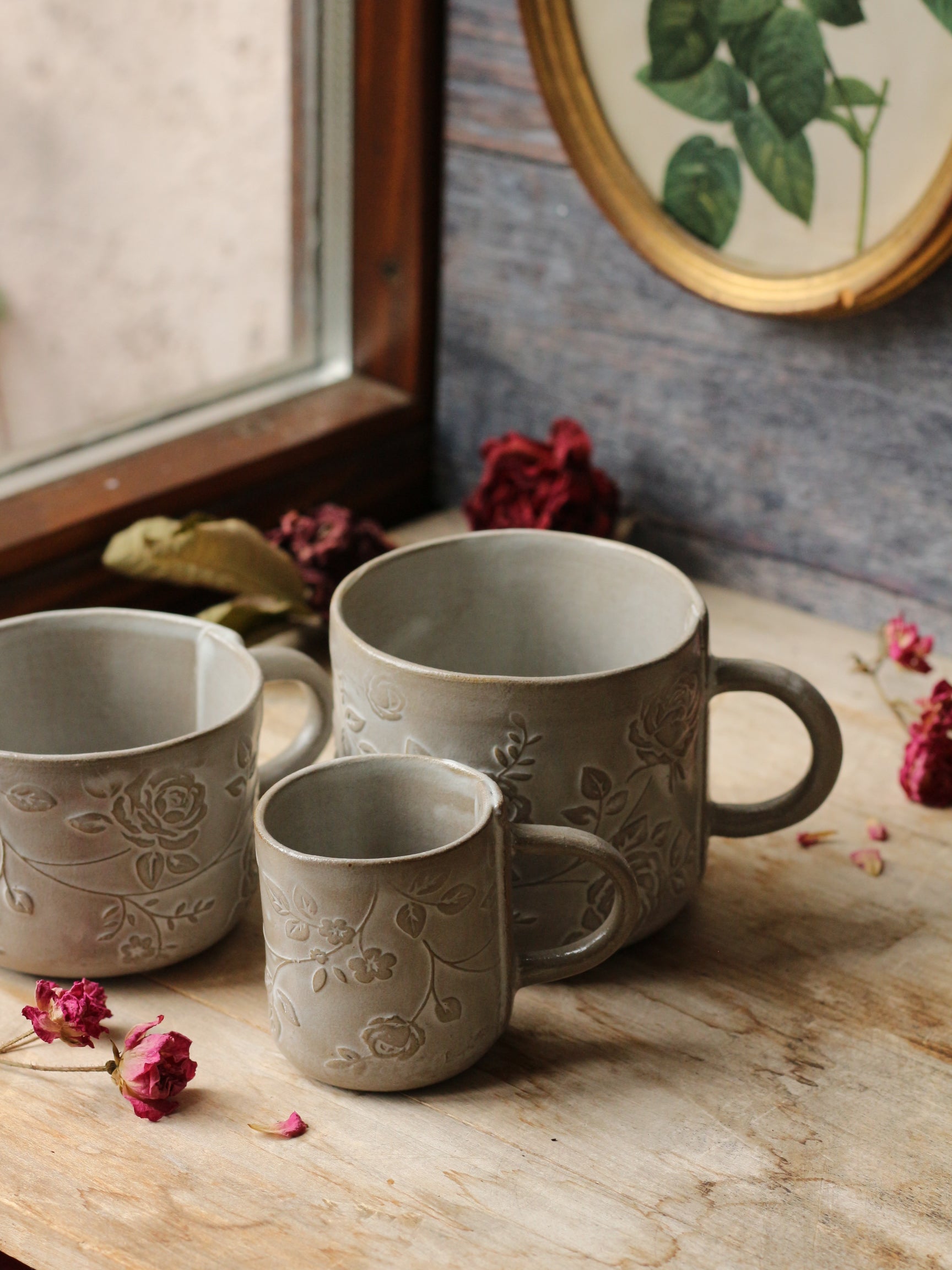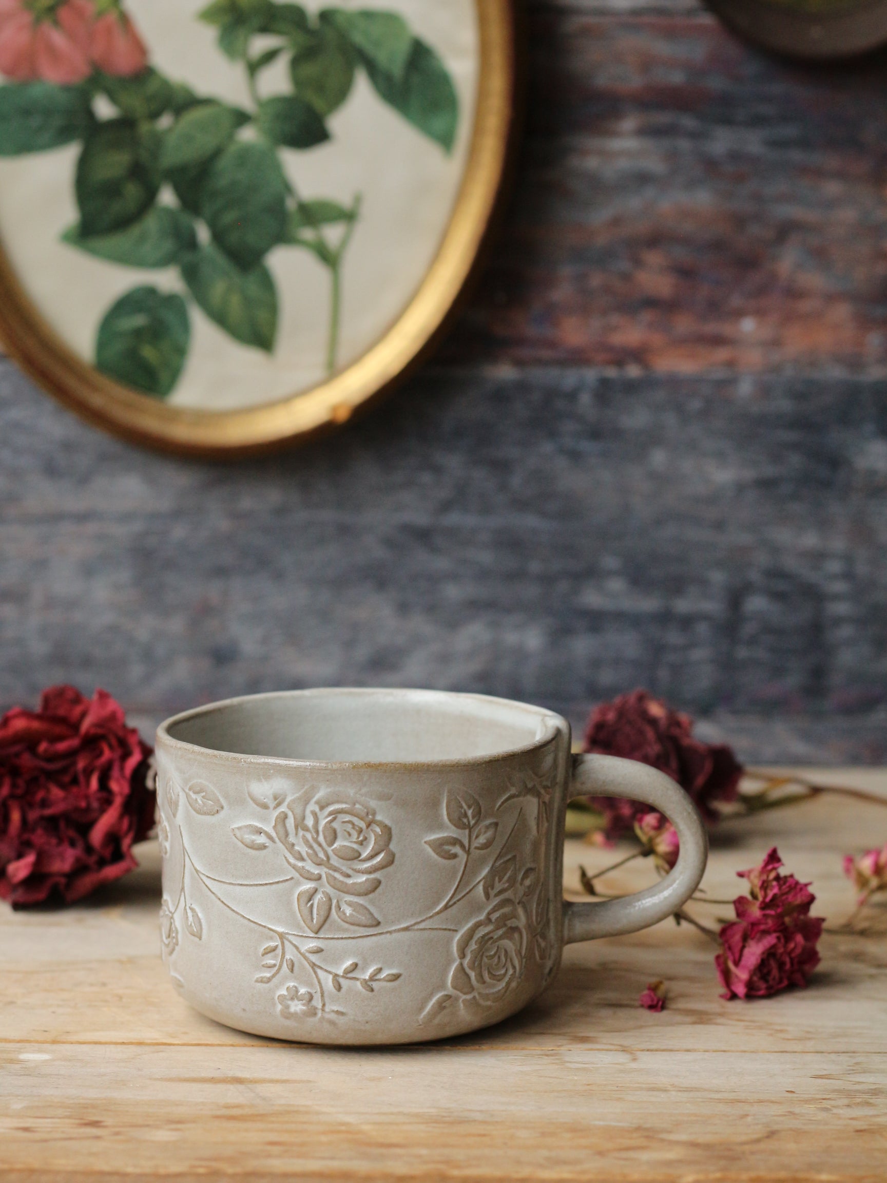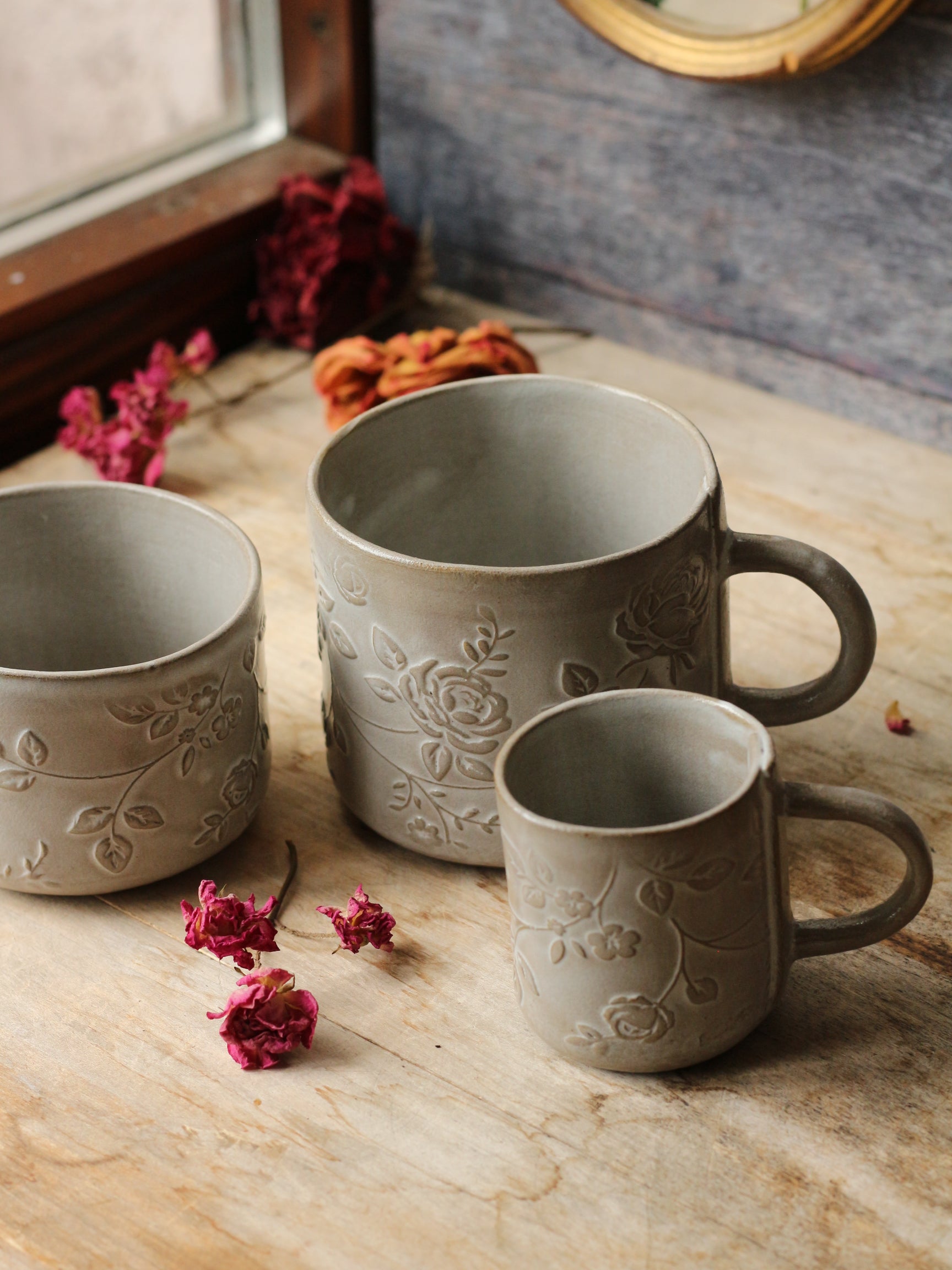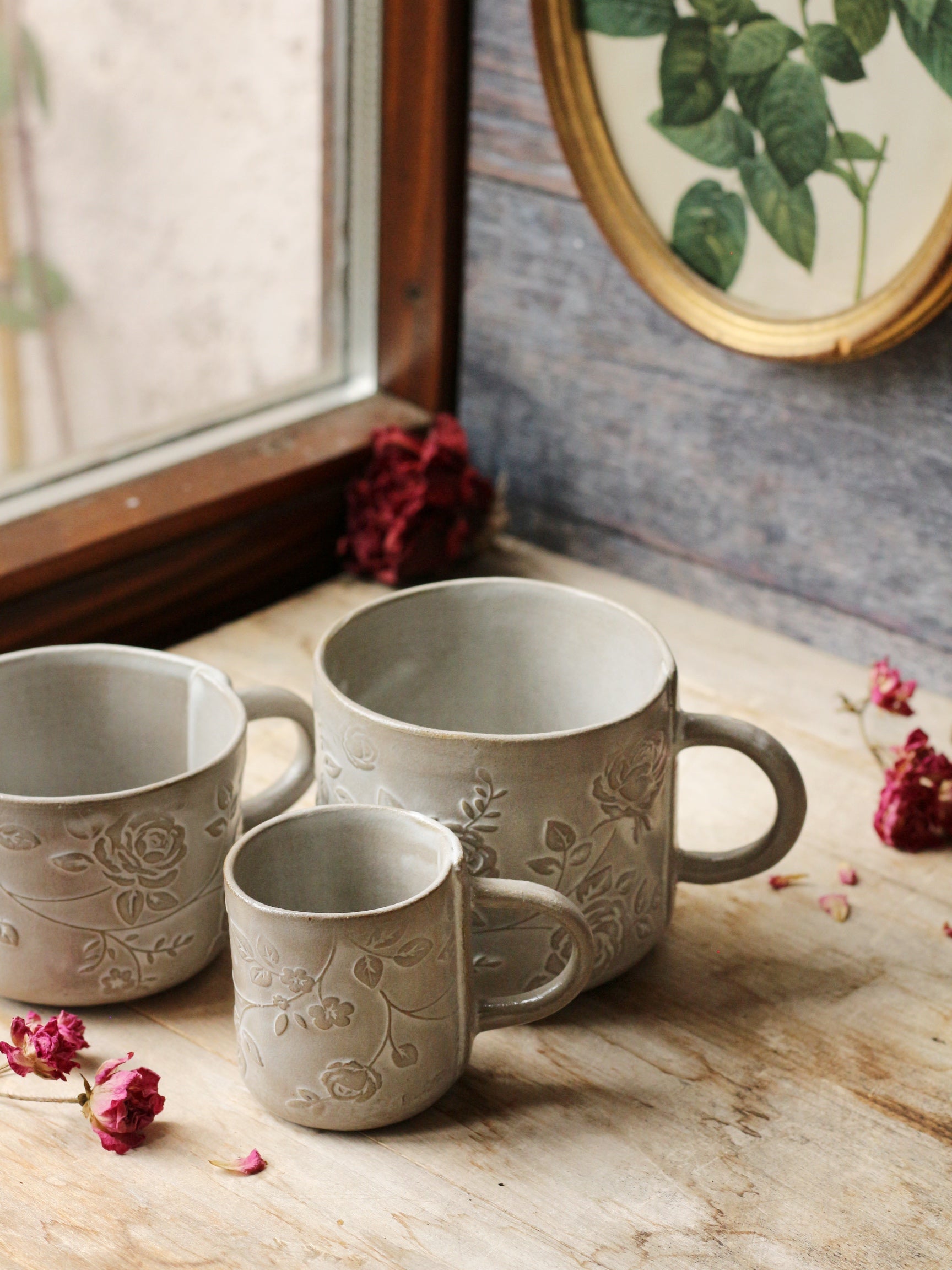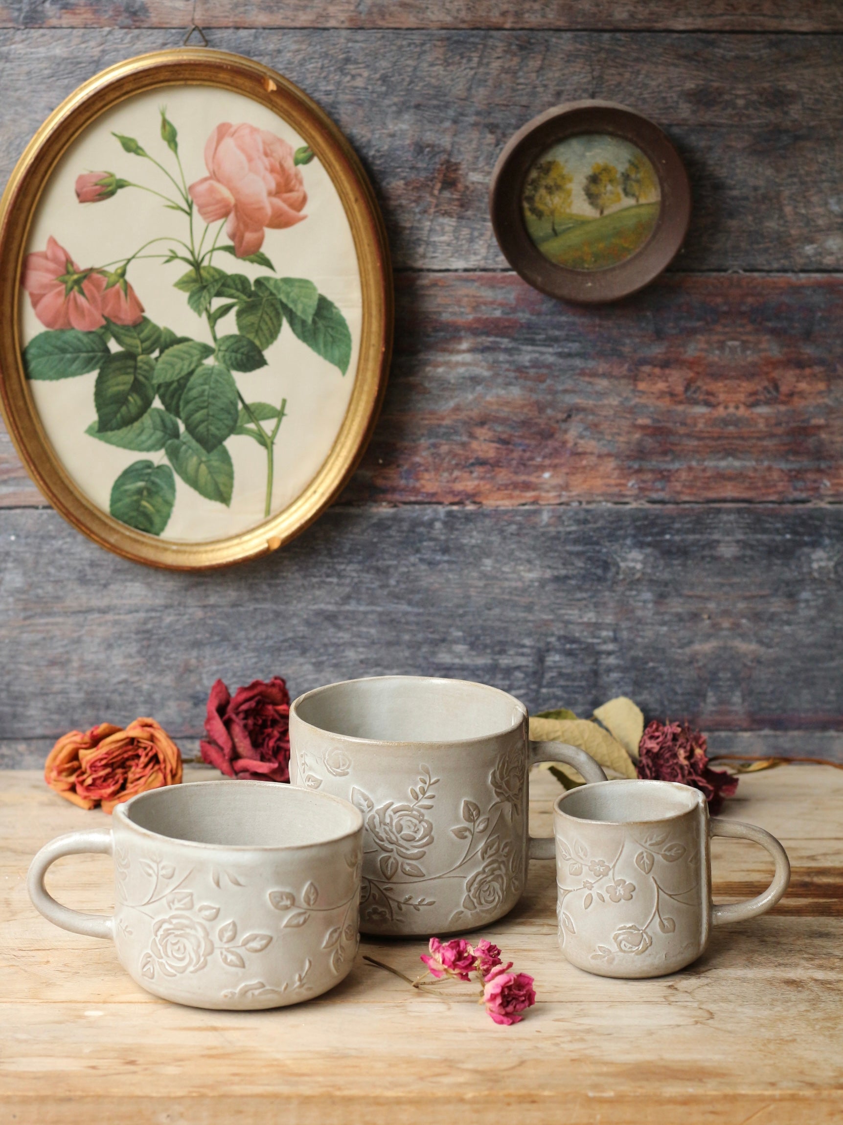 Cambiano le stagioni, ma le rose fioriscono sempre sulle nostre tazze in gres! E' arrivata un'elegante famigliola di tazze, decorata con delicati ed eleganti rameggi di rose a rilievo. Un po' romantiche, un po' vintage e perfette per caffè, cappuccino, tè e tisane. La smaltatura può essere irregolare e sfumata, con qualche goccia più bianca laddove è stata usata la pinza per la smaltatura ad immersione (ogni pezzo è unico e porta il segno di una lavorazione esclusivamente manuale!). Realizzate in gres scuro cotto ad alta temperatura, adatte a lavastoviglie e microonde, disponibili in tre formati, da abbinare anche al piccolo vassoio ovale "Rose":