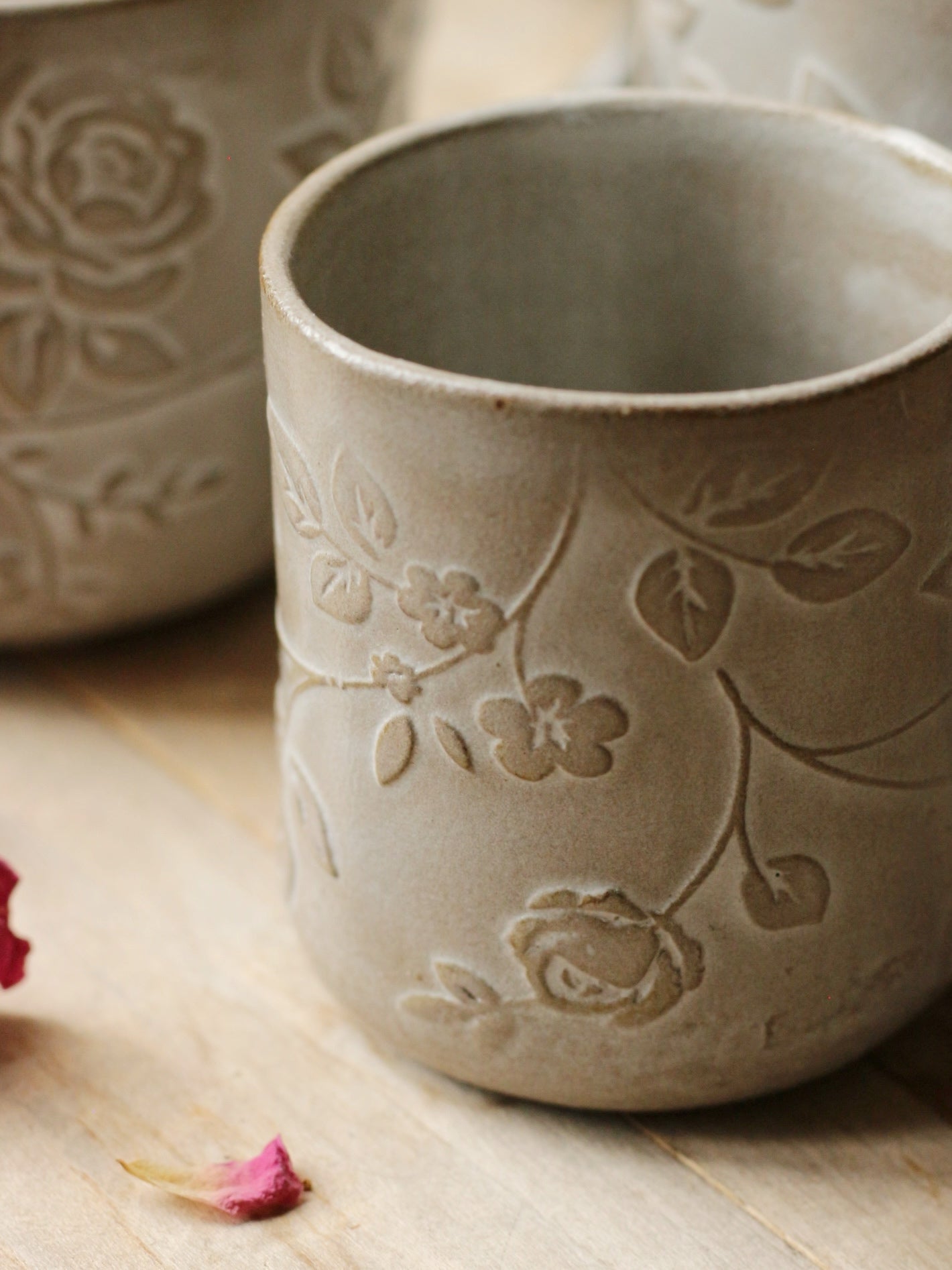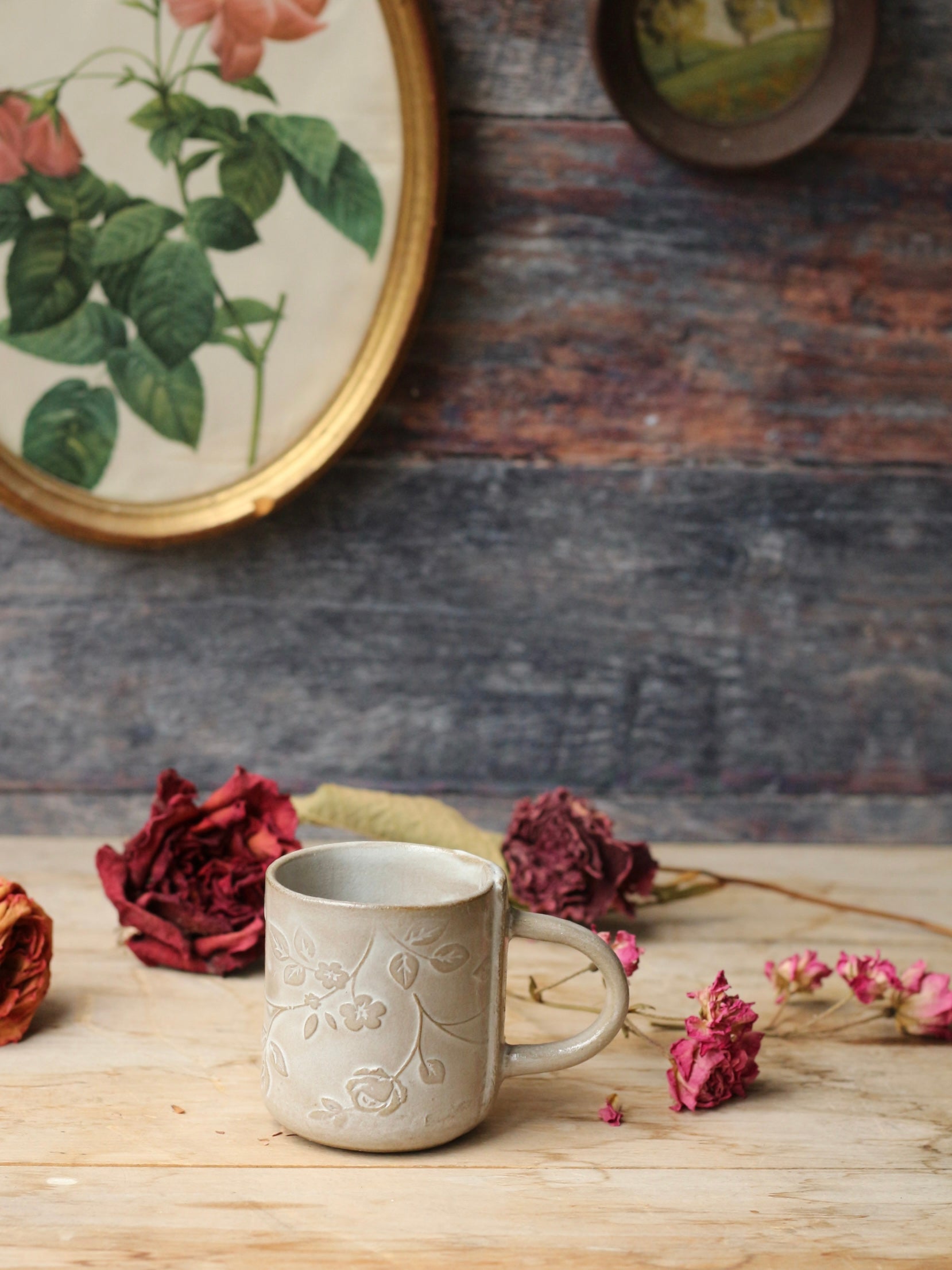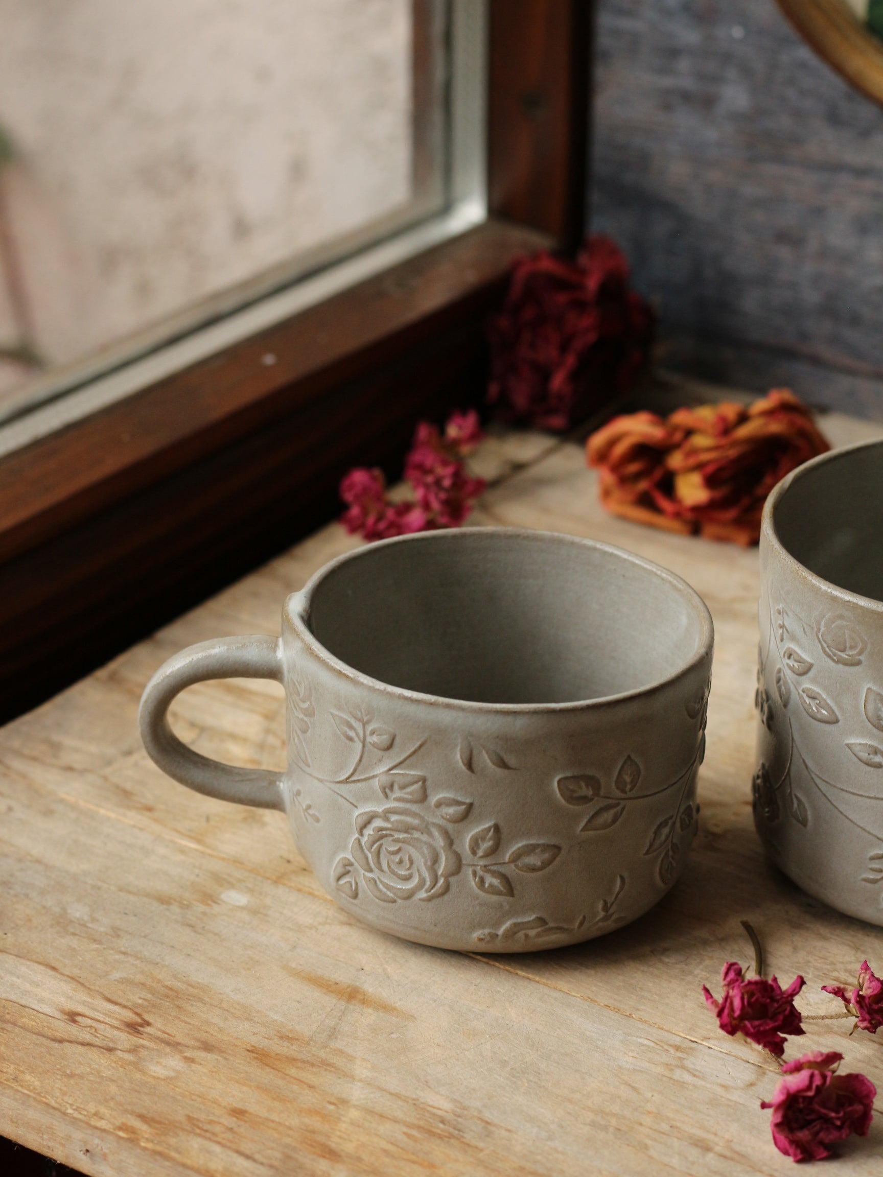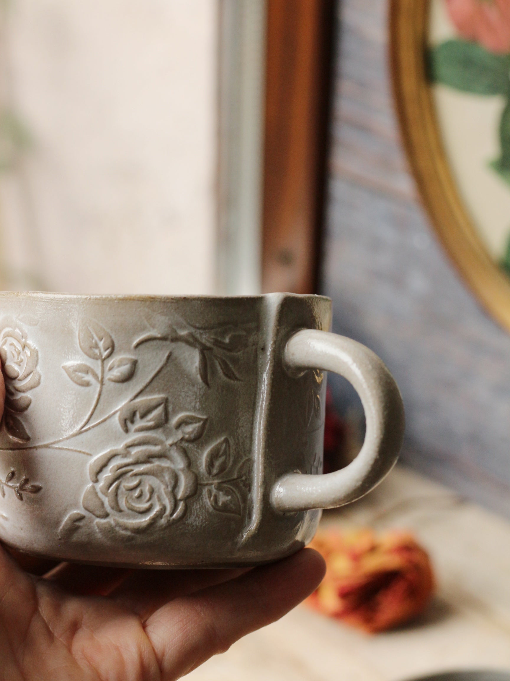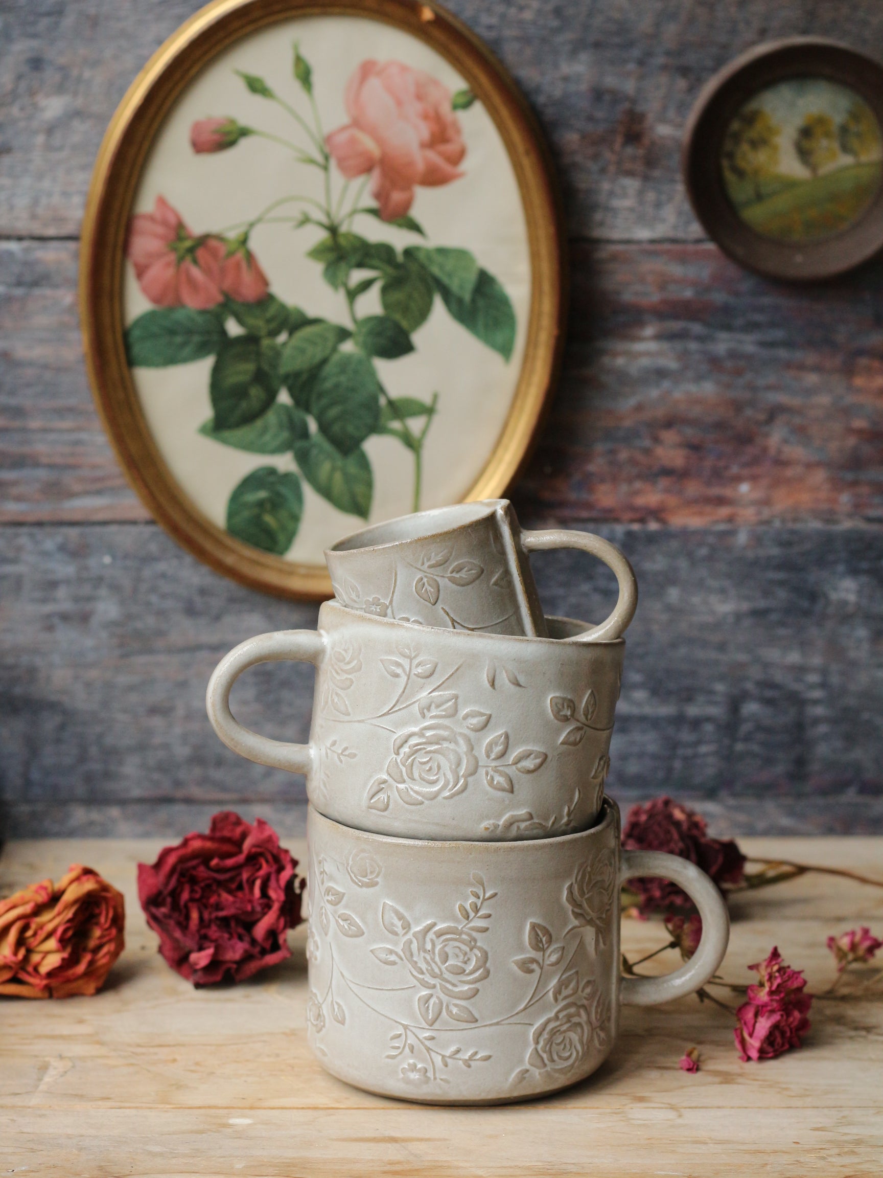 Cambiano le stagioni, ma le rose fioriscono sempre sulle nostre tazze in gres! E' arrivata un'elegante famigliola di tazze, decorata con delicati ed eleganti rameggi di rose a rilievo. Un po' romantiche, un po' vintage e perfette per caffè, cappuccino, tè e tisane. La smaltatura può essere irregolare e sfumata, con qualche goccia più bianca laddove è stata usata la pinza per la smaltatura ad immersione (ogni pezzo è unico e porta il segno di una lavorazione esclusivamente manuale!). Realizzate in gres scuro cotto ad alta temperatura, adatte a lavastoviglie e microonde, disponibili in tre formati, da abbinare anche al piccolo vassoio ovale "Rose":