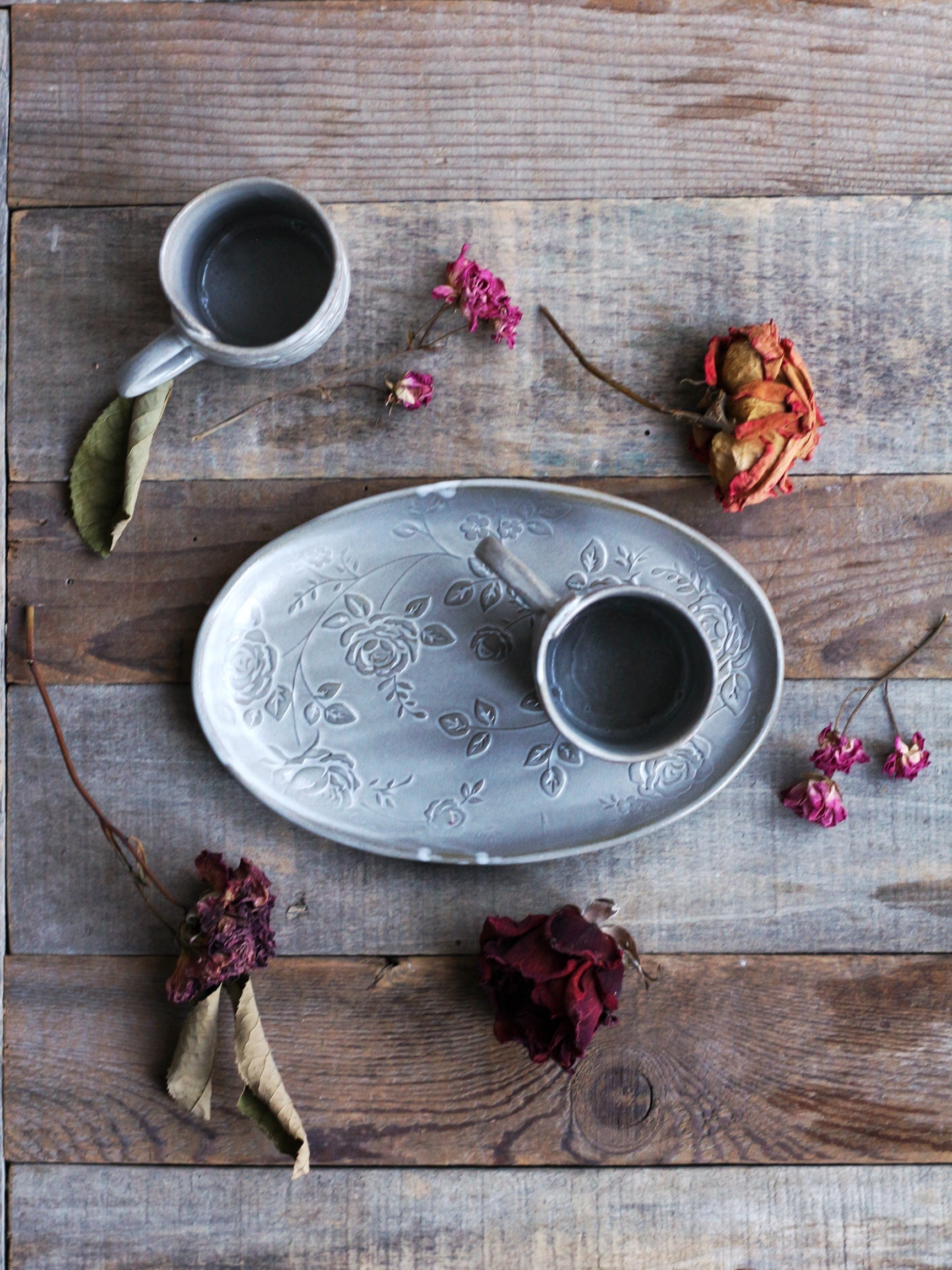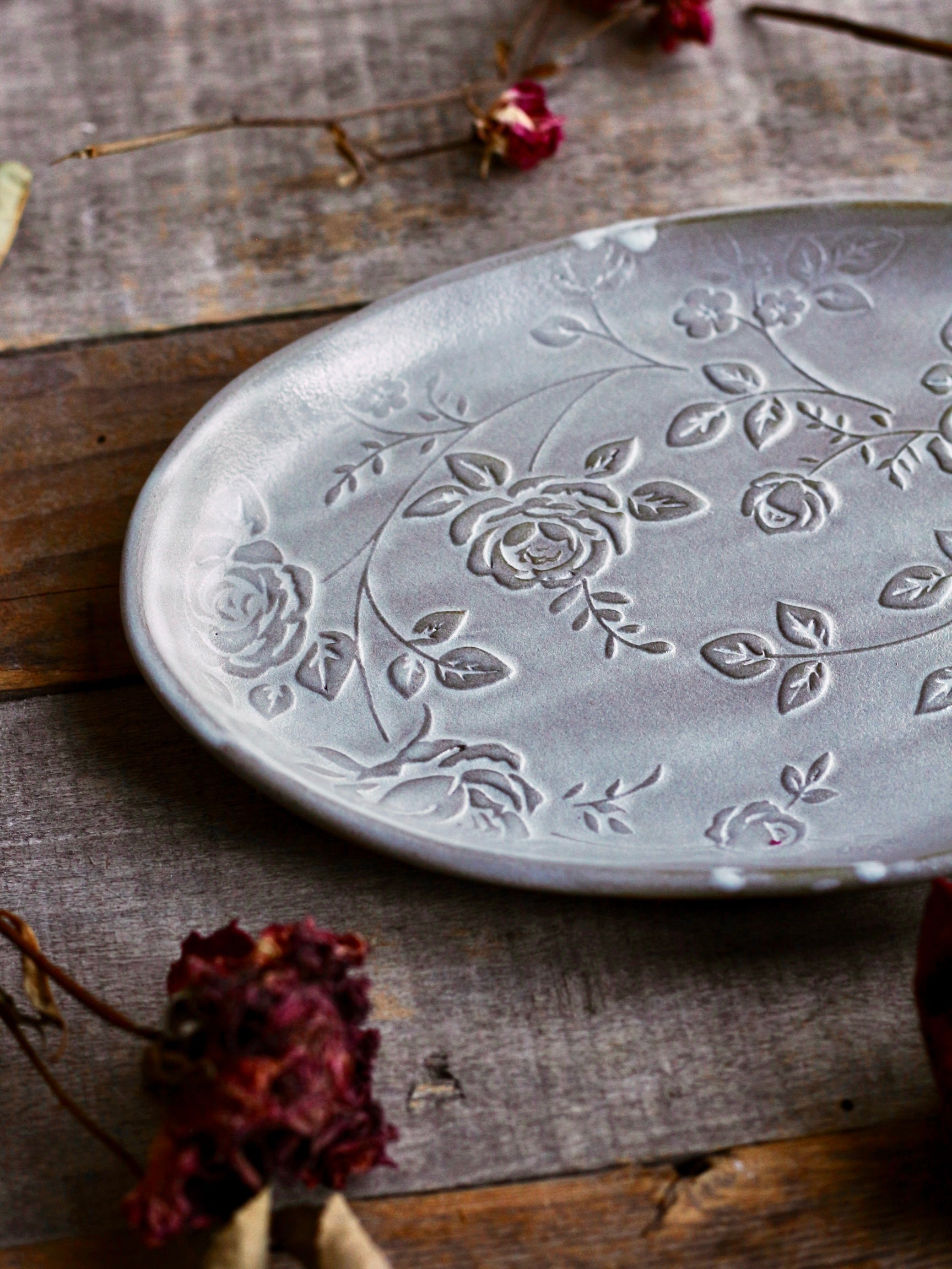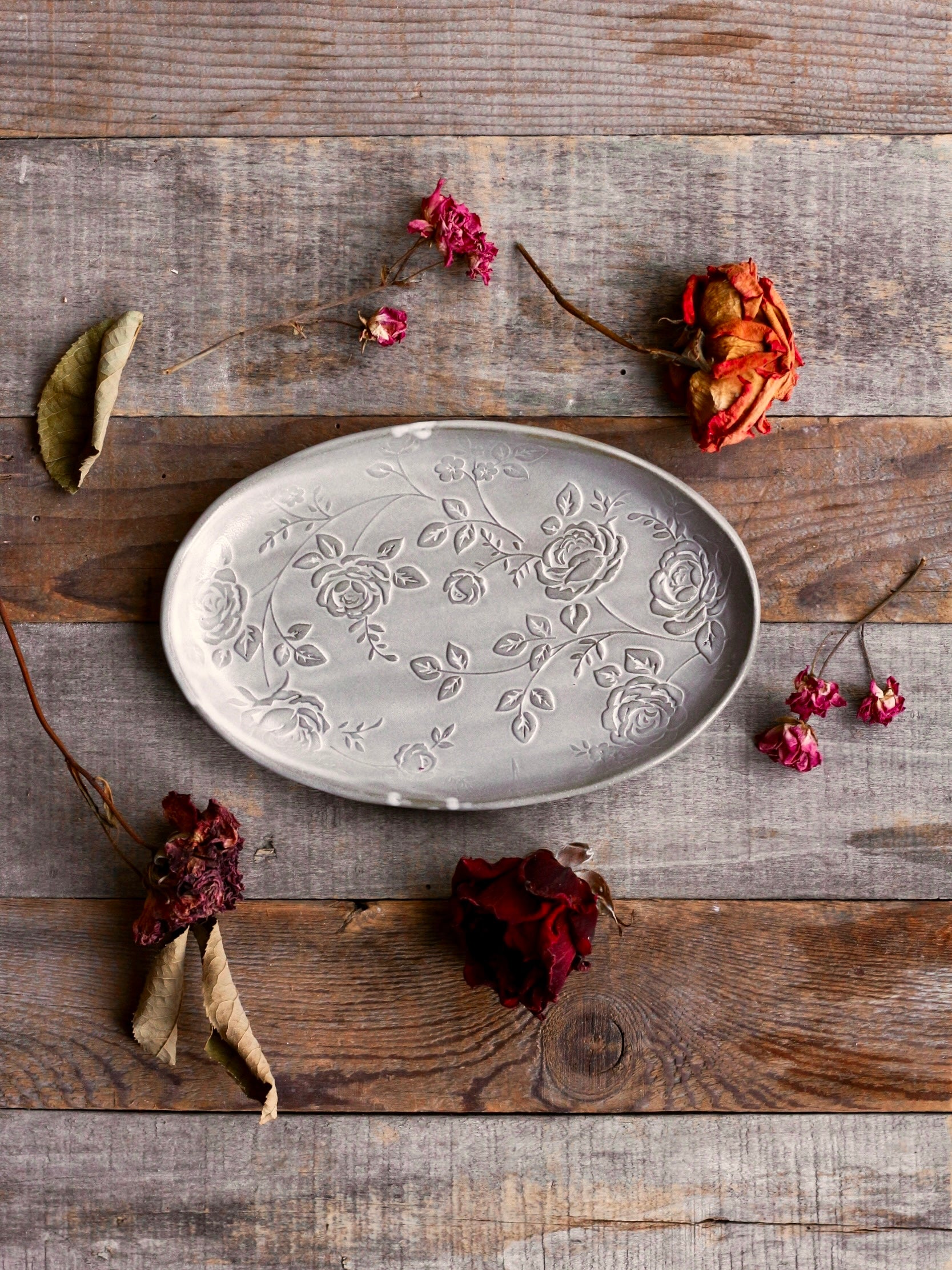 Piccolo e romantico vassoio ovale, decorato con delicati rameggi di roselline a rilievo. Perfetto per servire biscottini e dolcetti o da abbinare alle nostre tazze "Rose". La smaltatura può essere irregolare e sfumata, con qualche goccia più bianca laddove è stata usata la pinza per la smaltatura ad immersione (ogni pezzo è unico e porta il segno di una lavorazione esclusivamente manuale!). Realizzato in gres scuro cotto ad alta temperatura, adatto a lavastoviglie e microonde, Lungh. cm 19 x Largh. cm 12. Il prezzo indicato è inteso per il singolo vassoio.