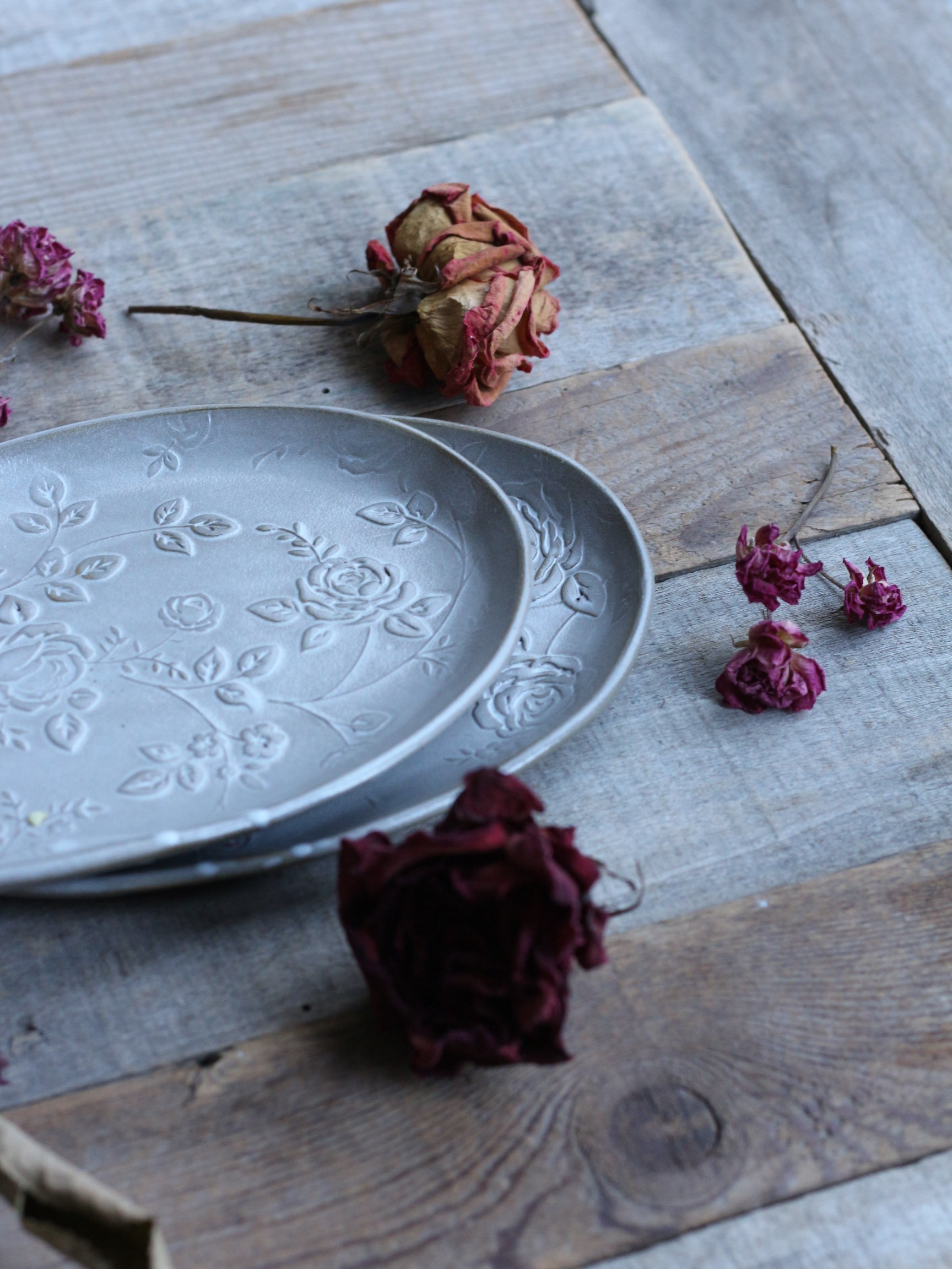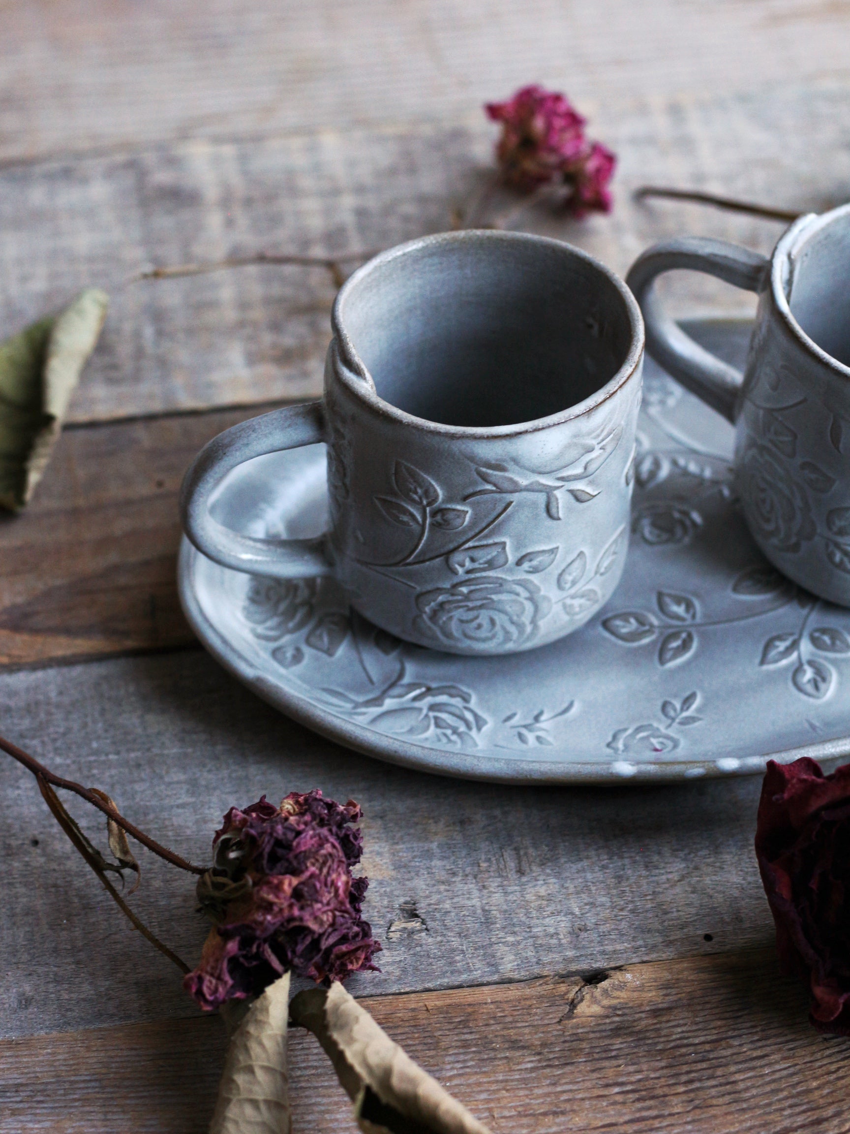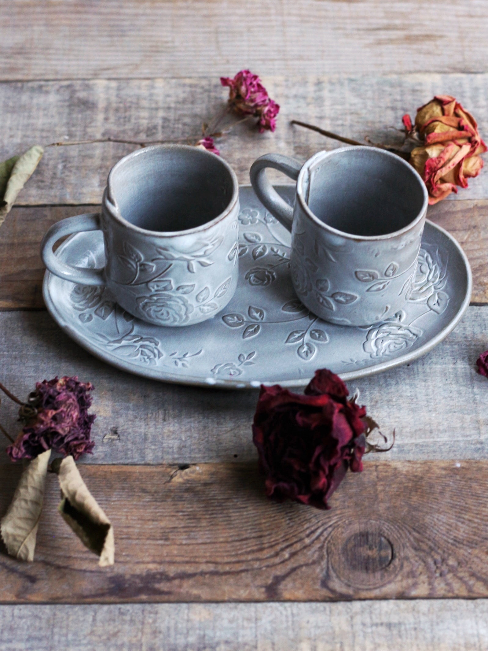 Piccolo e romantico vassoio ovale, decorato con delicati rameggi di roselline a rilievo. Perfetto per servire biscottini e dolcetti o da abbinare alle nostre tazze "Rose". La smaltatura può essere irregolare e sfumata, con qualche goccia più bianca laddove è stata usata la pinza per la smaltatura ad immersione (ogni pezzo è unico e porta il segno di una lavorazione esclusivamente manuale!). Realizzato in gres scuro cotto ad alta temperatura, adatto a lavastoviglie e microonde, Lungh. cm 19 x Largh. cm 12. Il prezzo indicato è inteso per il singolo vassoio.